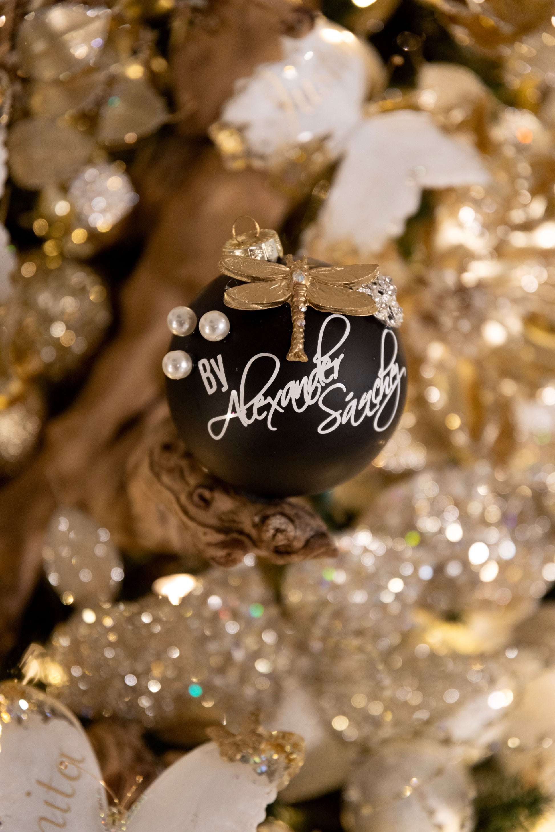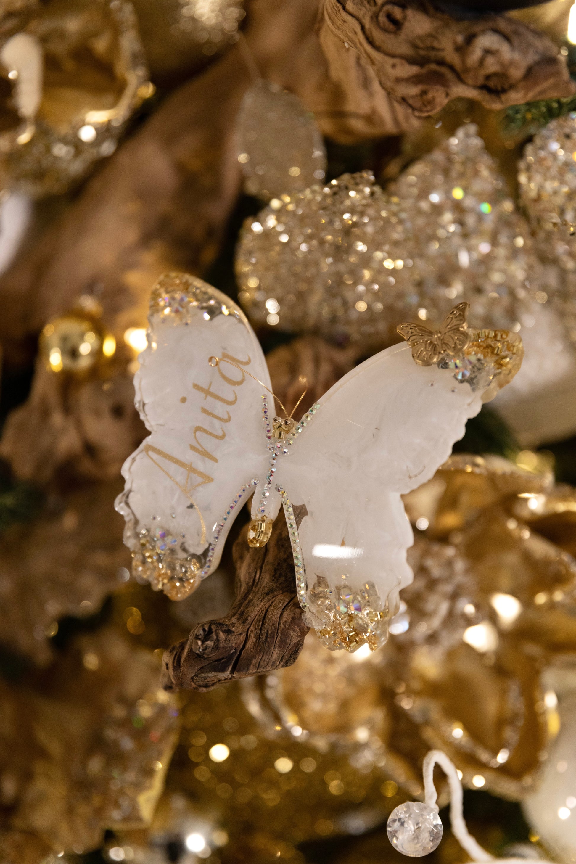In this Christmas tree where white and gold are mixed, made with spheres, crystals, mirrors, and exclusive butterflies made of resin made in our workshop, arranged around the tree with the final touch of a 65cm butterfly on the top. tip.