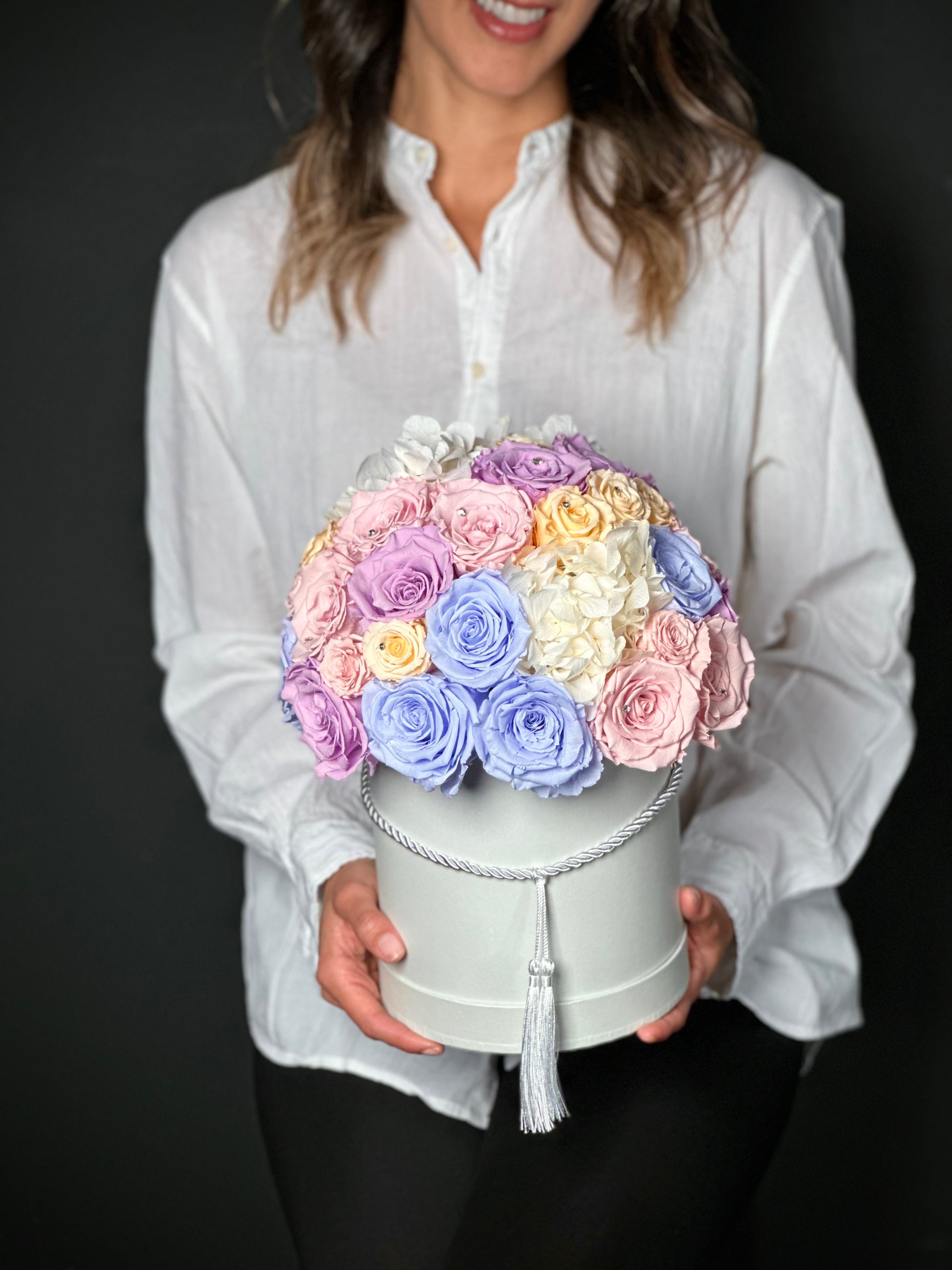 A stunning piece featuring preserved roses that will remain beautiful for years to come. This delicate and charming arrangement is perfect for adding a touch of elegance to any space or as a heartfelt gift for someone special. The romantic and timeless beauty of preserved roses makes Forever Blooms a symbol of everlasting love and affection.