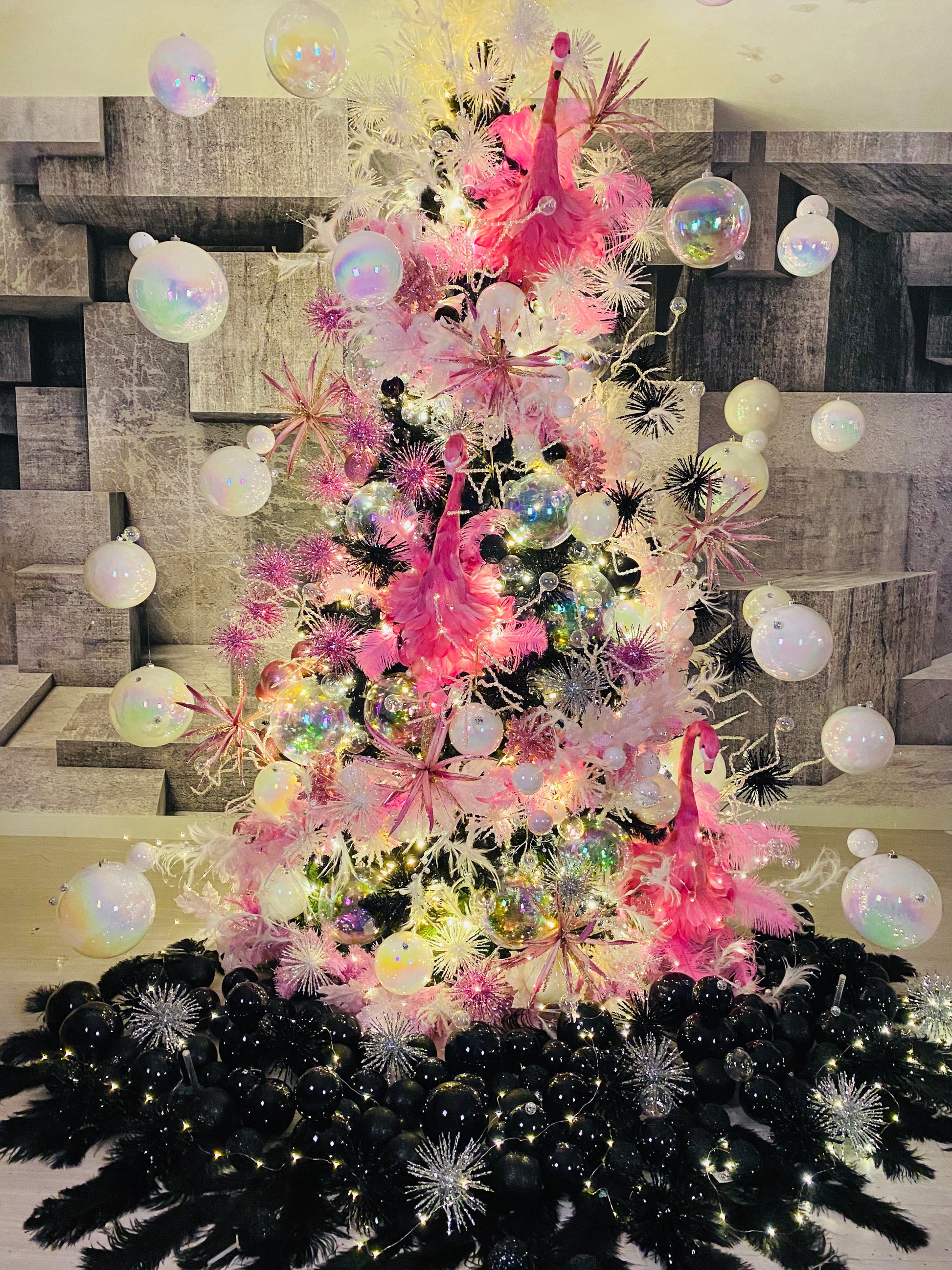 This Christmas Tree combines pink and black, giving a modern and luxurious effect, matching the spheres around it while giving a feeling of being submerged in water and complemented with three beautiful flamingoes arranged in ascending form.