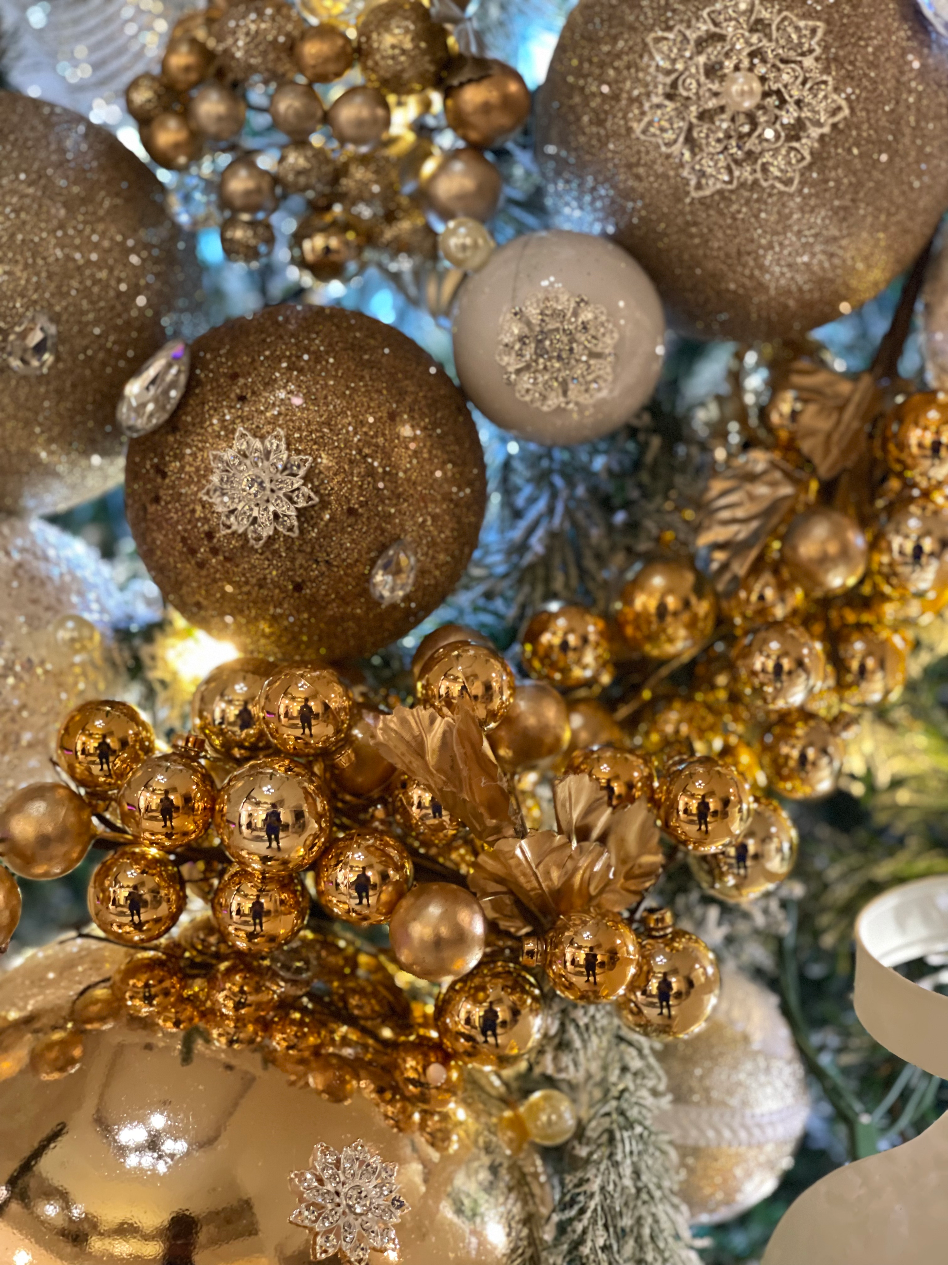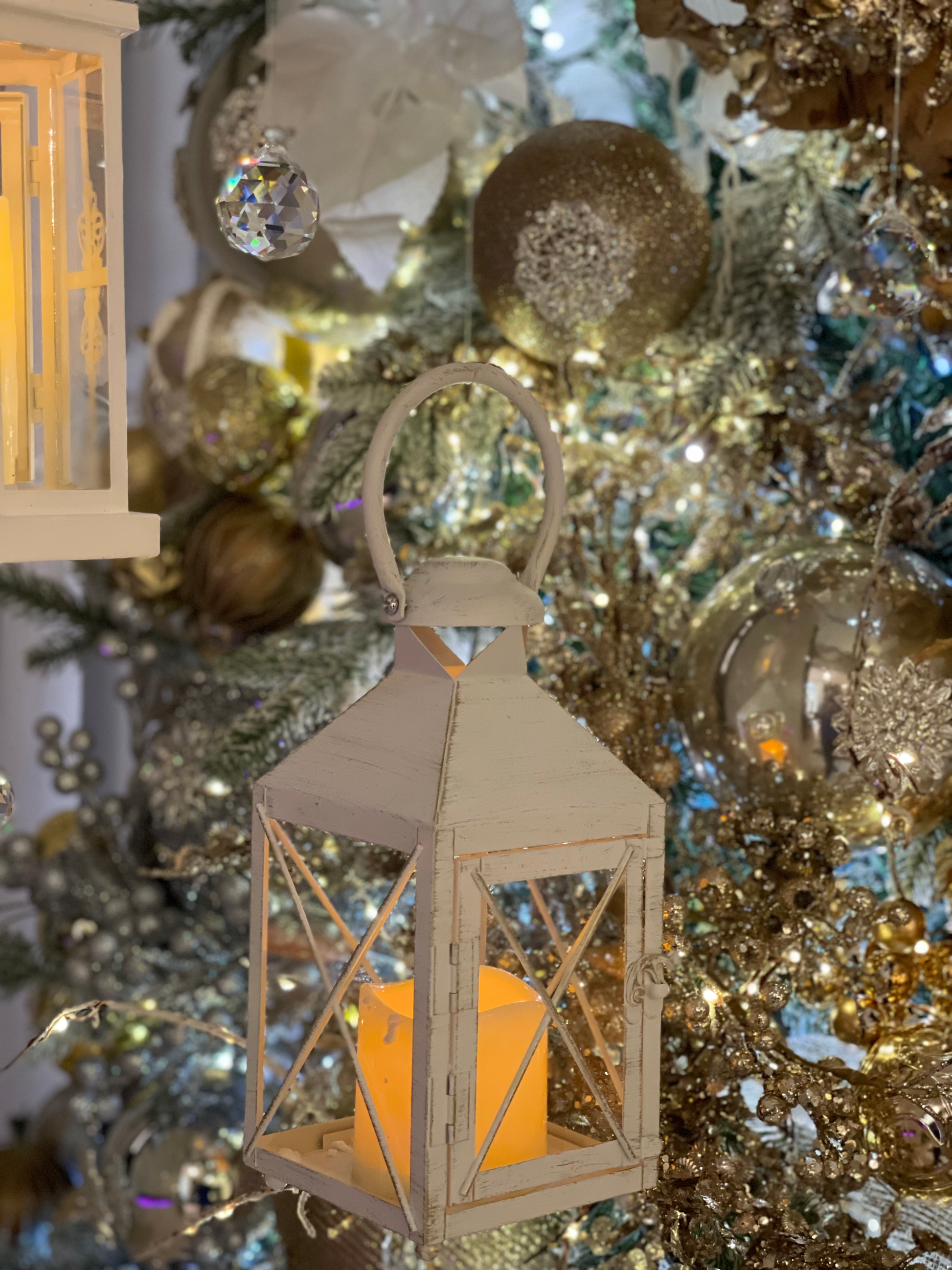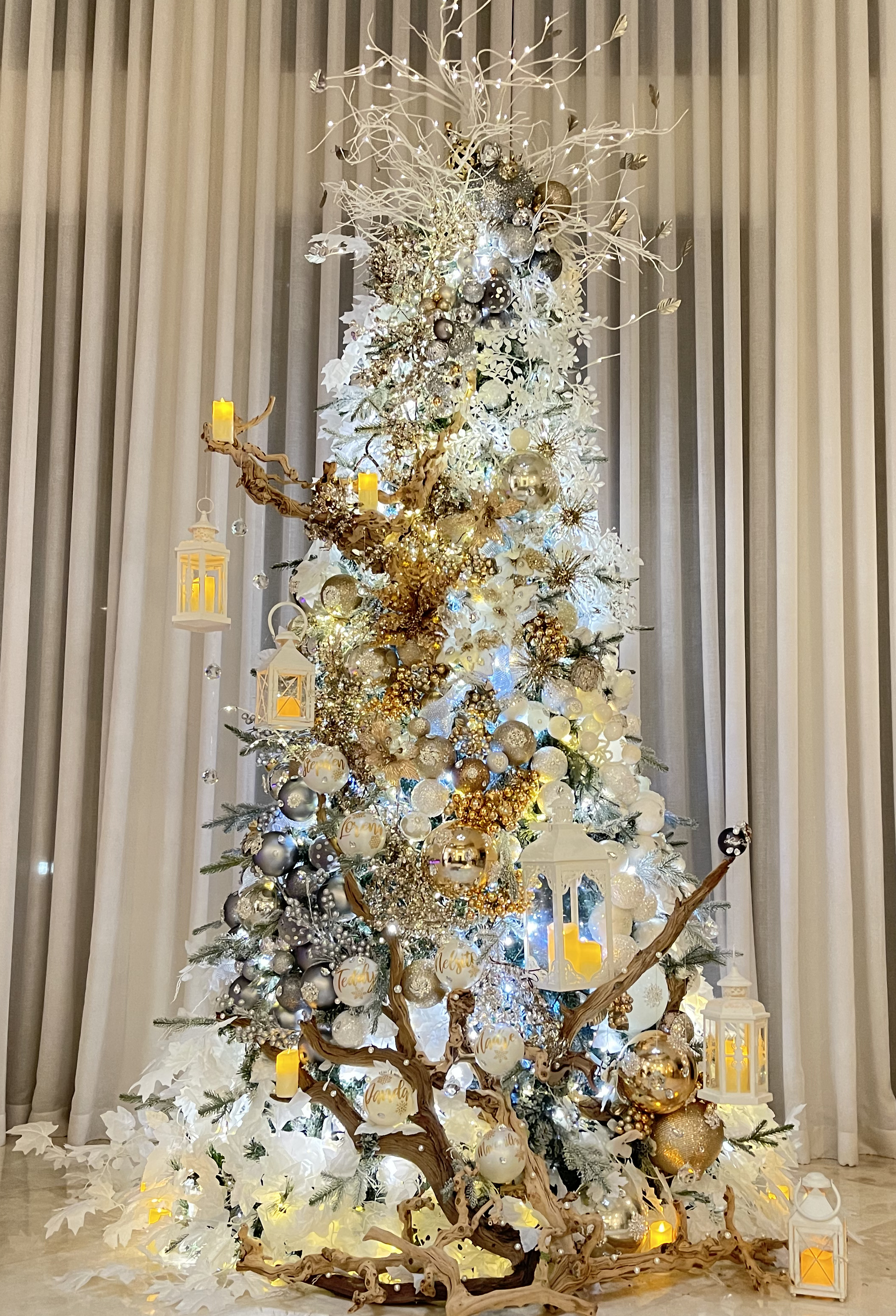 This piece mixes the elegance of white and gold, with a touch of silver. It is a work full of delicacy and grace with crystals, and pearls, complemented with natural logs and white candle lanterns to give light to this beautiful work of art.