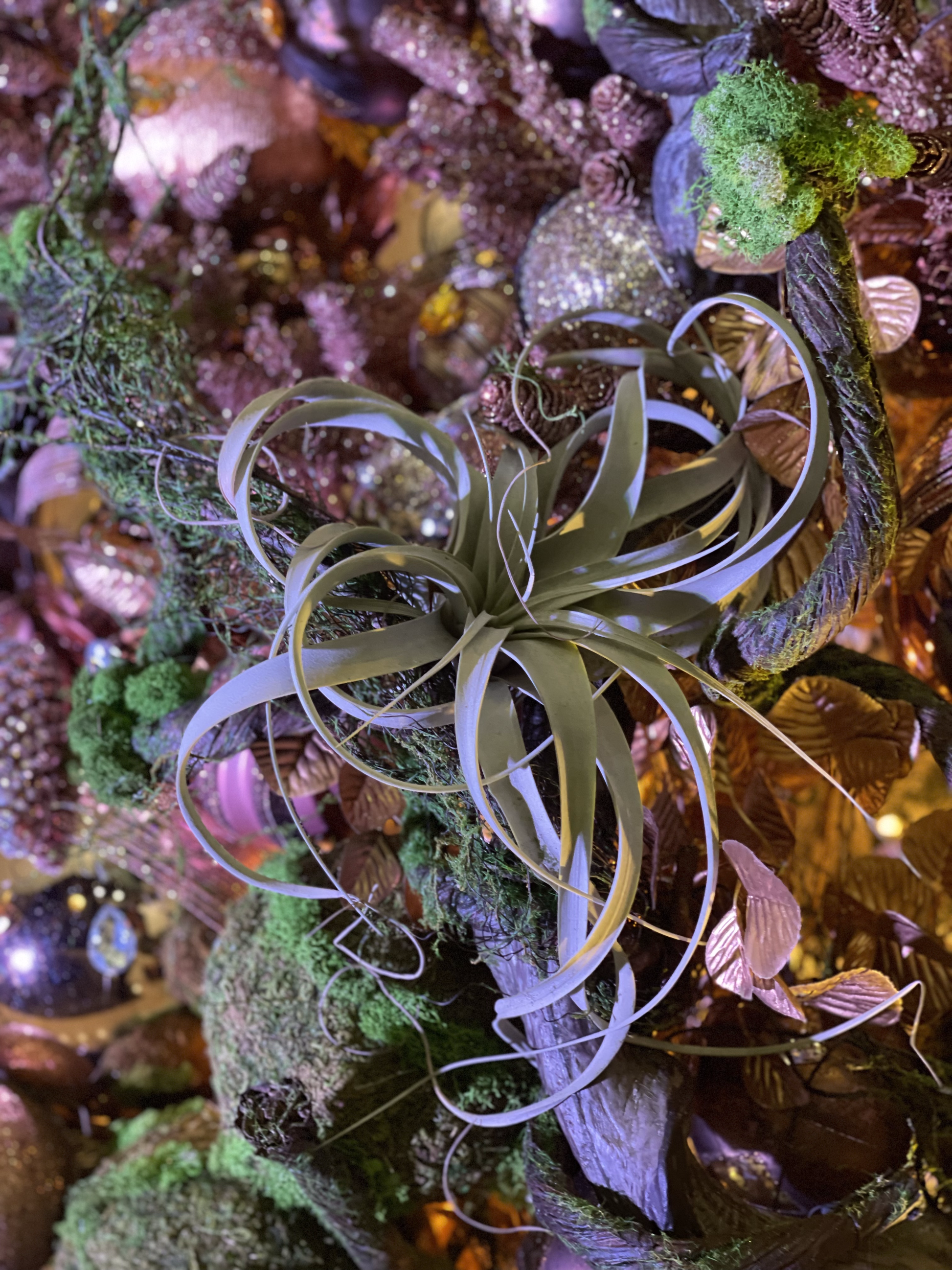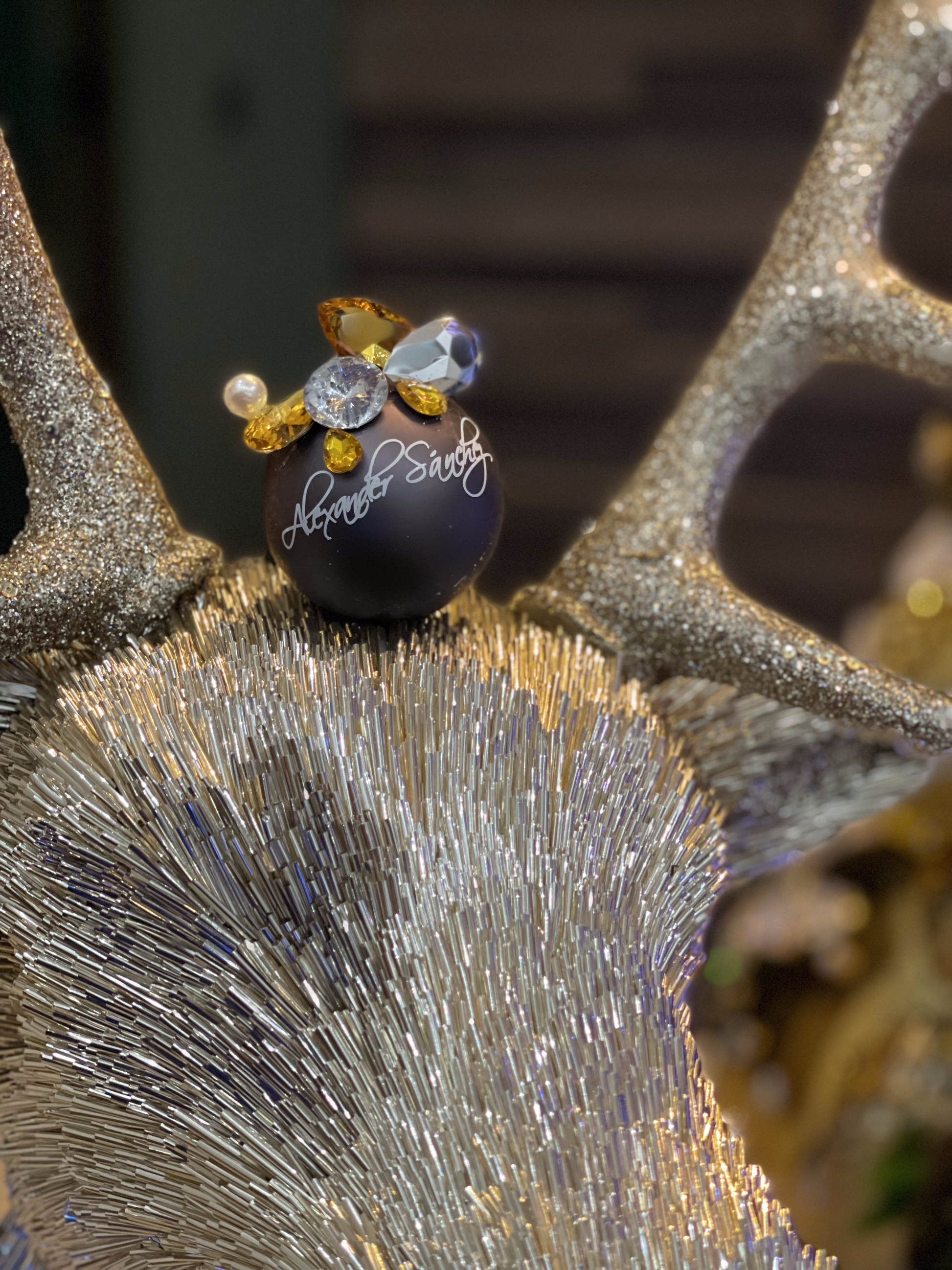 Snowy tree complemented by 2 spectacular gold reindeer. This piece has a natural-looking luxury design, using logs and plants as a predominant element to create the scenery and structure of the theme of this wonderful work of art. A daring and elegant concept using copper, gold, rose gold, white and black, with touches of green provided by natural plants.